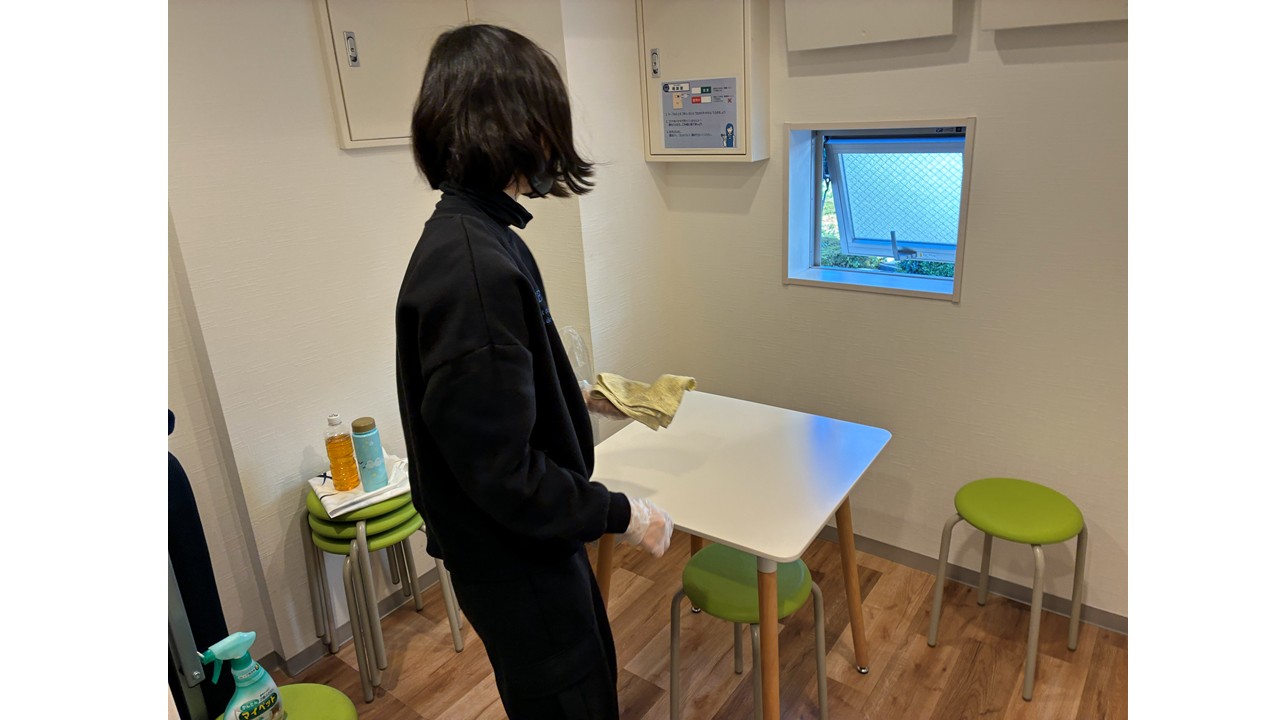 利用者の皆さんでチームに分かれ、それぞれが担当する場所を決めて掃除をスタートしました。机周りや共有スペース、細かな部分まで役割分担をしながら、計画的に進めることができました。